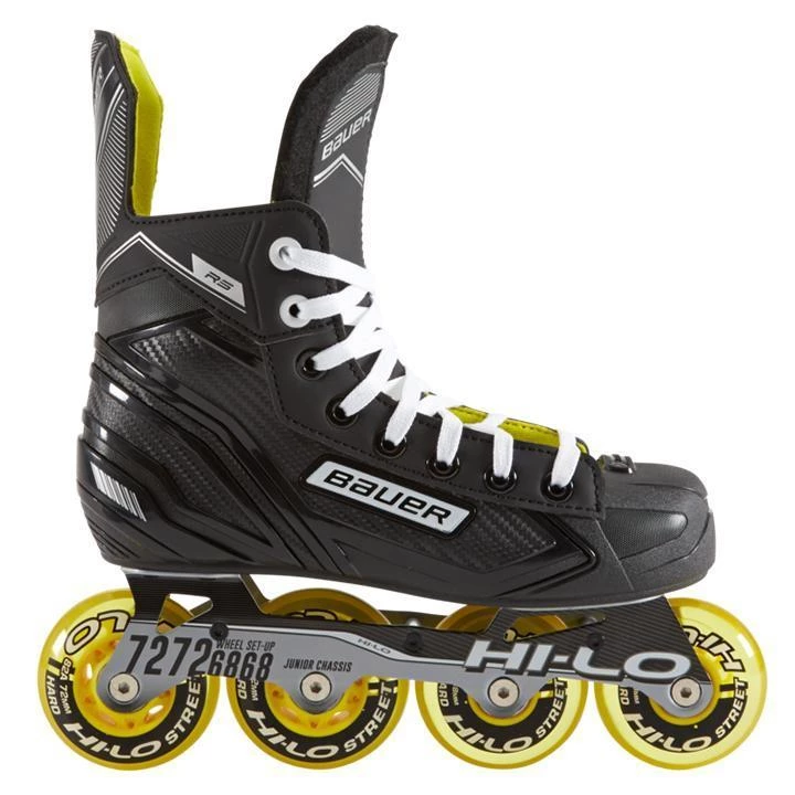 Bauer RS Roller Hockey Skates are available in Senior sizes. The RS is a great entry-level to intermediate skate at an affordable price that is ready to hit the streets. The Hi-Lo Street wheels are a hard 82A, aimed at being fast and durable on outdoor surfaces. The Steel Ventilator frame fits 2 x 80mm + 2 x 76mm which we believe offers the most agile and natural feel for inline hockey.