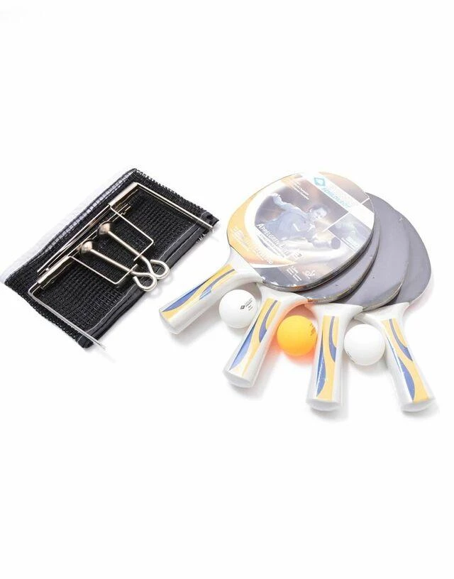 The net includes sturdy steel net posts and clamps and a green nylon net with steel ends. The steel ends slip easily over the posts and give rigid structure to the net ends. The posts can be pushed in or out to tension the net, or relieve tension between playing sessions. There are two 40mm white balls and one orange ball so you’re sure to have the right one for best visibility in a variety of playing conditions. A very good 4-player set that gives you all the basic gear you need to enjoy playing singles or doubles with friends or family.