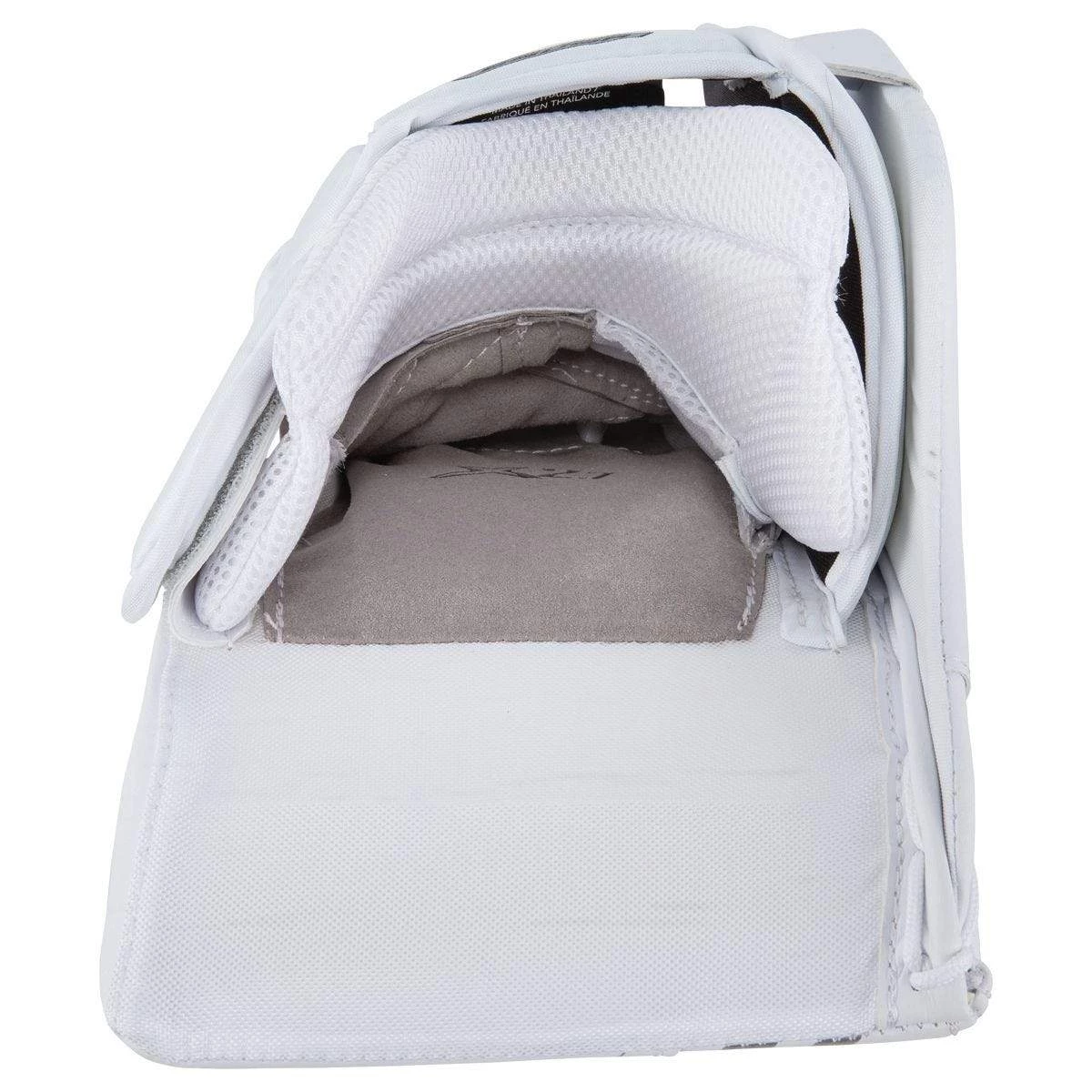 Looking at the face of the Bauer Vapor X2.7 Senior, you will notice the one piece board shape design with a defined top angle made of HD foam to help direct rebounds to corners and give the goaltender time to recover. Wrapping around to the inner sidewall, the Vapor X2.7 is designed with strategic cuts to create a solid blocking surface with a lightweight design.