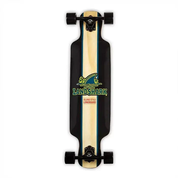 LandShark Longboard Skateboard Smooth Cruising Effortlessly cruise, carve, and make your way around town on the LandShark Island Style Longboard. This is the perfect skateboard for beginners or anyone looking for a smooth ride. With the top deck fully covered in grip tape, there is plenty of traction on this board. Once comfortable cruising, the rider can push themselves further into harder carves, and thanks to the deck cutouts, the fear of getting tossed as a result of wheelbite can be a thing of the past. Enjoy your new-found freedom on the LandShark Island Style Longboard. Features Deck: 35“ x 9.25“ – Constructed from 8-ply maple Classic longboard shape with a retro, surf-style design – perfect for cruising, carving and even commuting Deck cutouts eliminate wheelbite during sharp turns 7“ Aluminum trucks – Lightweight, durable, and stable 61mm x 54mm PU wheels with ABEC-7 precision carbon steel bearings