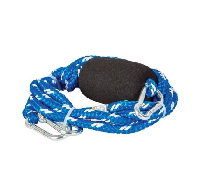If your boat does not have a center tow pylon or a center towing hook (most older I/O’s, outboards, and pontoon boats), then you probably need a ski tow harness to equalize the pull of a skier/tuber/wakeboarder, etc. This is our least expensive option, and it does its job quite nicely. 8′ width, with two high-strength coated steel snap-hooks. A vinyl float to keep the rope out of the propeller. 12 Strand x 84 Filament Polypro RopeO’Brien 8′ Floating Ski Tow Rope Harness (Blue)