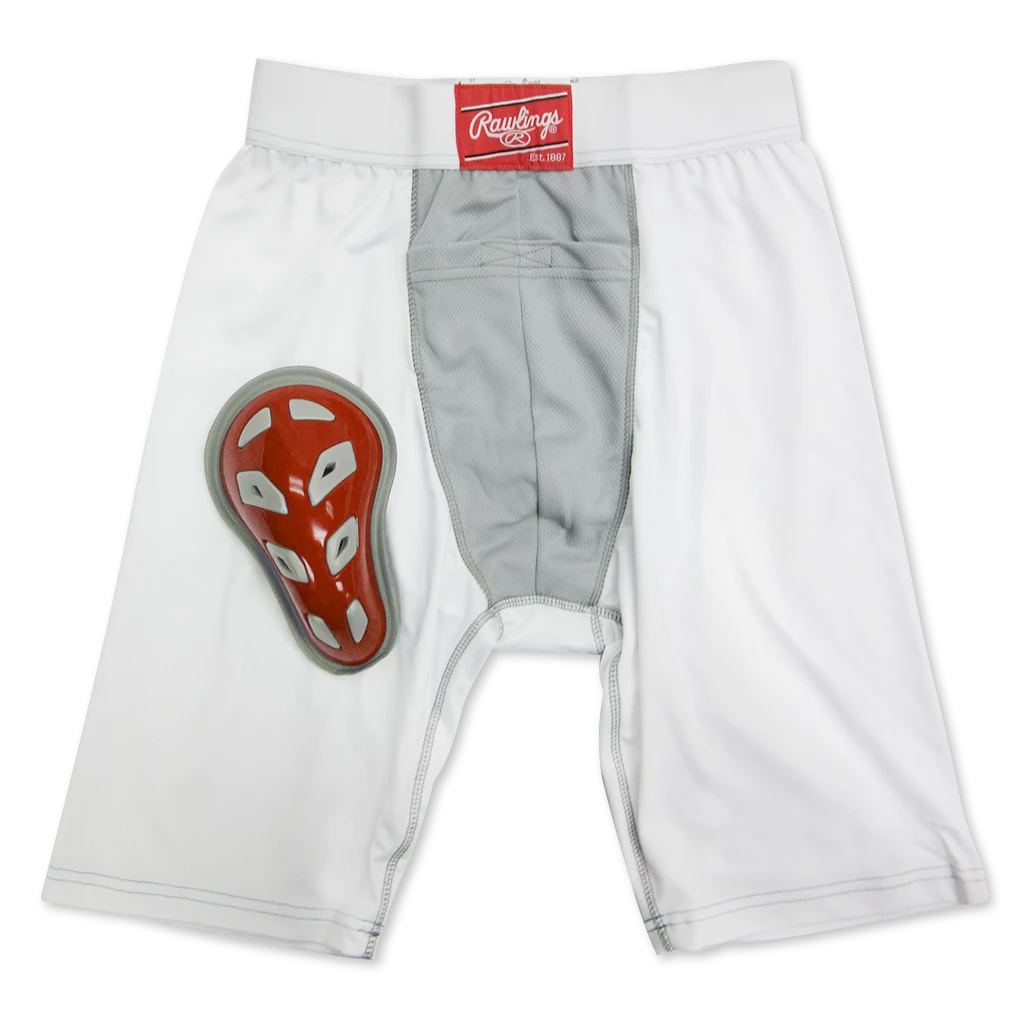 Rawlings moisture wicking compression jock short features ergonomically designed cup with tabbed closure. Offers reinforced stitching and a heavy duty waistband for added durability.