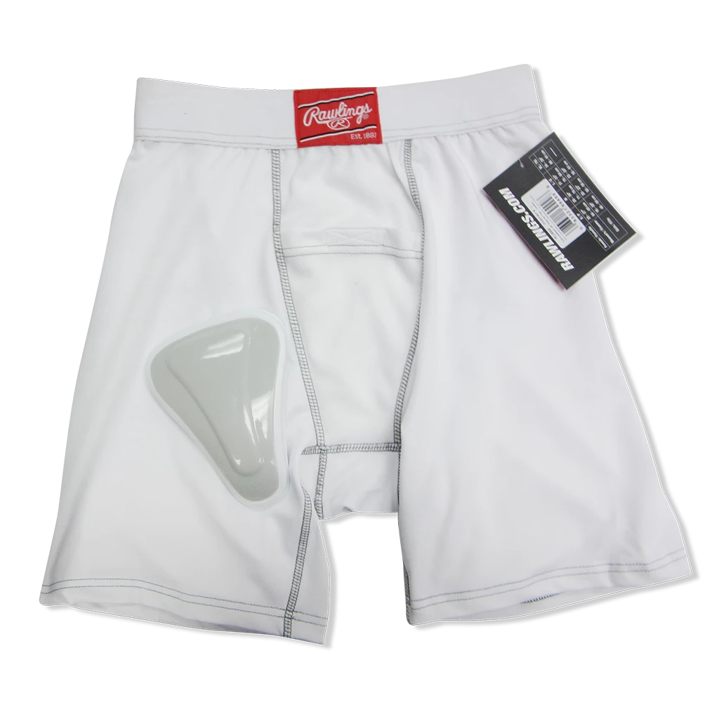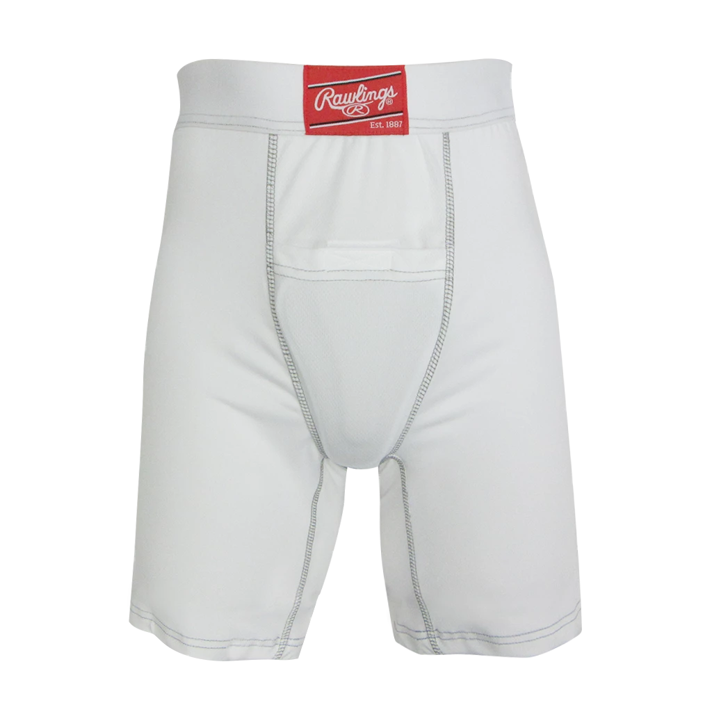 Rawlings moisture wicking compression jill short features ergonomically designed pelvic protector. Â Offers reinforced stitching and a heavy duty waistband for added durability.
