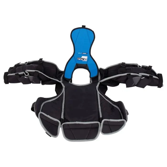 Starting off with the front section of the Bauer GSX Chest Protector, you will see a slightly redesigned hybrid shoulder floater made to be mobile and protective for the goaltender when moving around the crease. Moving down further on this unit, a floating sternum piece provides extra protection to this key area when taking shots. All along the stomach section you will find dual density foam lining the entire stomach along with a core extension to offer additional protection if needed.