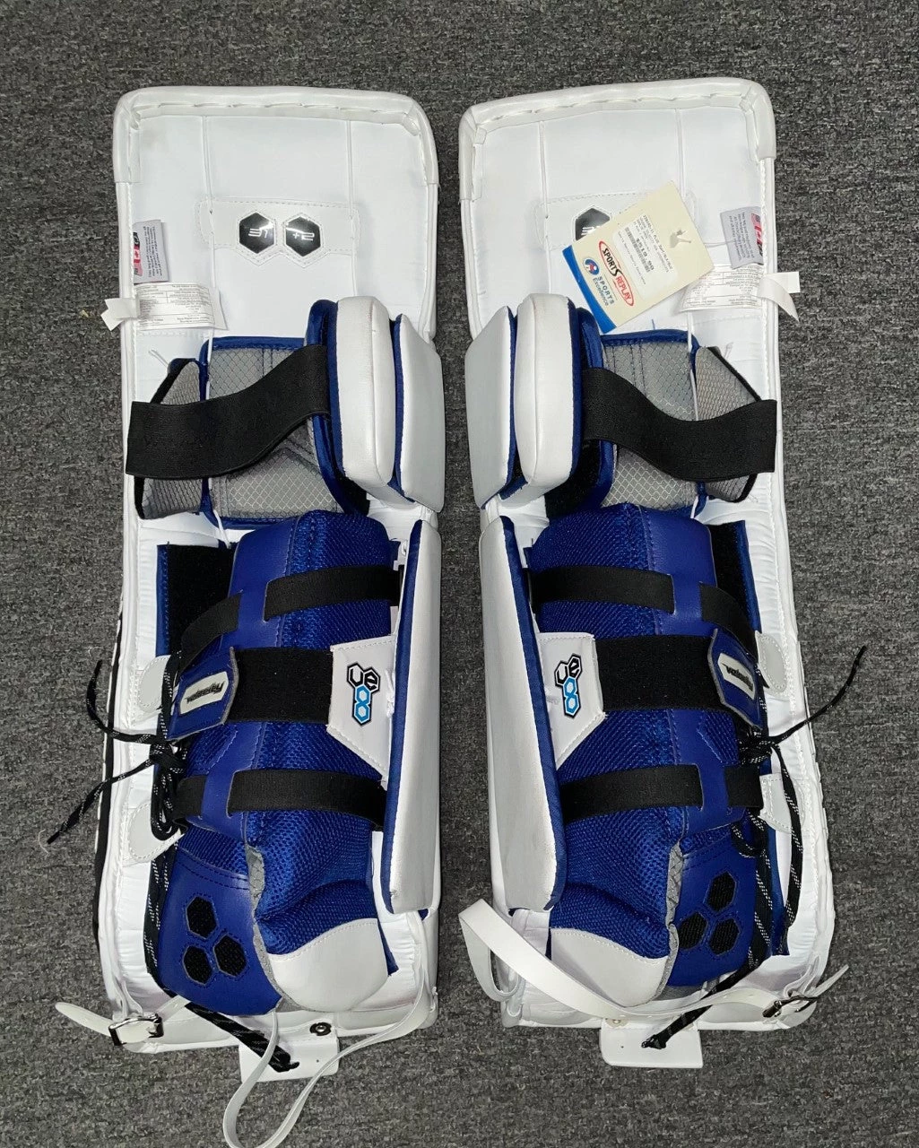 The Velocity VE8 goal pad has been completely re-designed for 2018. The biggest two changes a consumer will see is the strapping system and the reduction in weight. The previous generation Velocity V7 still had a traditional strapping system but the 2018 VE8 has gone to the quick strapping that is very popular these days. The VE8 uses elastic straps like most brands but with one major change from other competitors; they use a magnetic clip system to connect the strap to the pad. Most companies use Velcro to connect to the pad, this is great at the beginning but the Velcro tends to loose its sticking capacity very quickly. Once this happens, the strap becomes useless. With this magnetic clip system, you will never have to worry about debris getting in the Velcro and loosing its ability to attach. Another difference you will feel on the VE8 versus older Velocity series is a stiffer ankle flex. While still very flexible compared to a blocking or butterfly style pad, there was a lot of feedback from Vaughn’s hybrid style goalies wanted this area to be a bit stiffer as the older pads would break down very quickly in this area. Vaughn also made another change and that was to the top binding. The Vaughn went away from a thin traditional binding to a thicker and more square binding design. This design change will do a better job sealing the five hole and creating extra strength to the pad while in the butterfly position.