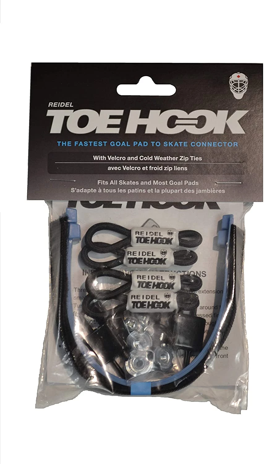 Toe Hook is a durable, easy-to-use, easy-to-install toe tie system that fits nicely on most pads and can be secured on any make of goal skates. Most Junior goalies will find that the system is easy to use, and Senior goalies will find less hip and back strain while using and attaching this system!Â