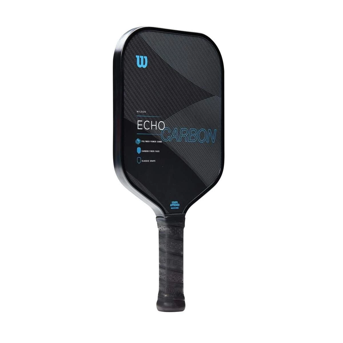 The Echo Carbon pairs sleek design with premium technology for avid pickleball players seeking championship-quality performance. Crafted with a woven layer of carbon fiber across the face for lightweight power alongside enhanced feel, this paddle features a classic shape with an extended handle that optimizes comfort for two-handed backhands. Look sharp and play sharper with this all-new paddle designed to bring home the hardware.